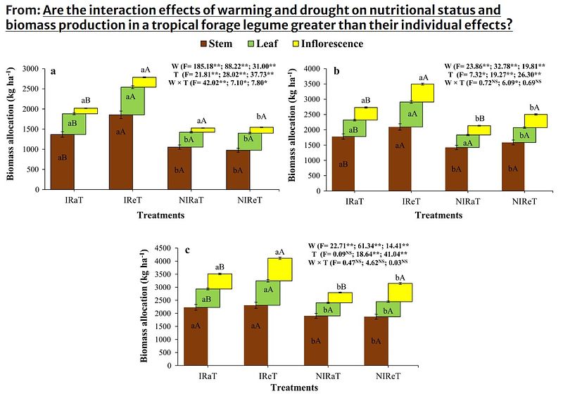 title = {Are the interaction effects of warming and drought on nutritional status and biomass production in a tropical forage legume greater than their individual effects?},
