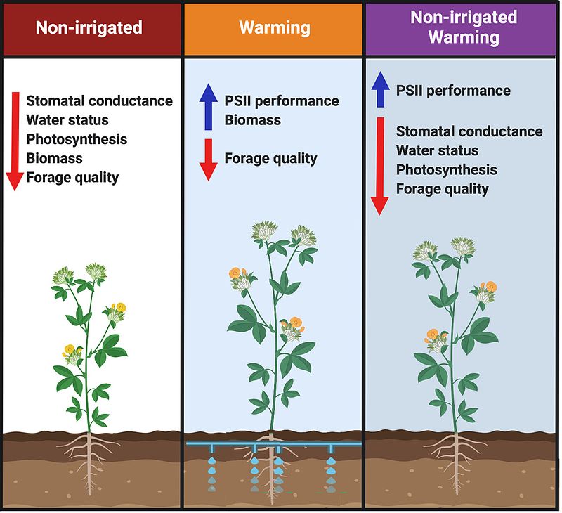 title = {How does leaf physiological acclimation impact forage production and quality of a warmed managed pasture of Stylosanthes capitata under different conditions of soil water availability?},