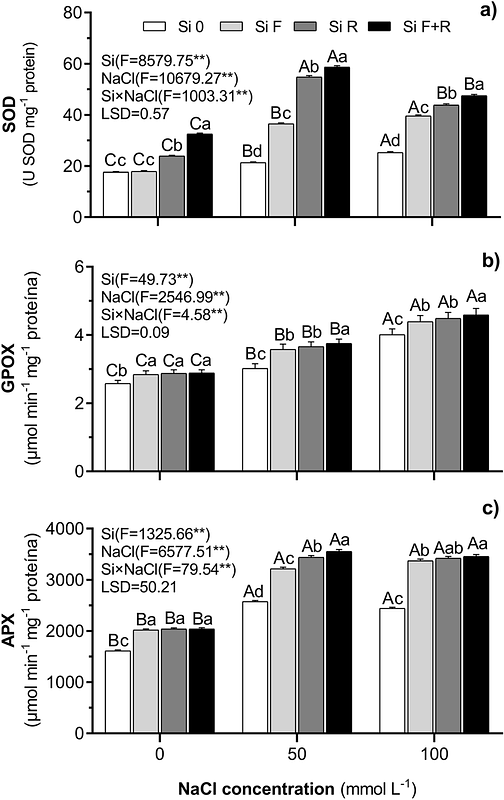 Calzada, K. P., Hurtado, A. C., Viciedo, D. O., Habermann, E., de Mello Prado, R., de Oliveira, R., … Gratão, P. (2023). Regulatory Role of Silicon on Growth, Potassium Uptake, Ionic Homeostasis, Proline Accumulation, and Antioxidant Capacity of Soybean Plants Under Salt Stress. Journal of Plant Growth Regulation, 42, 4528–4540. https://doi.org/10.1007/s00344-023-10921-4